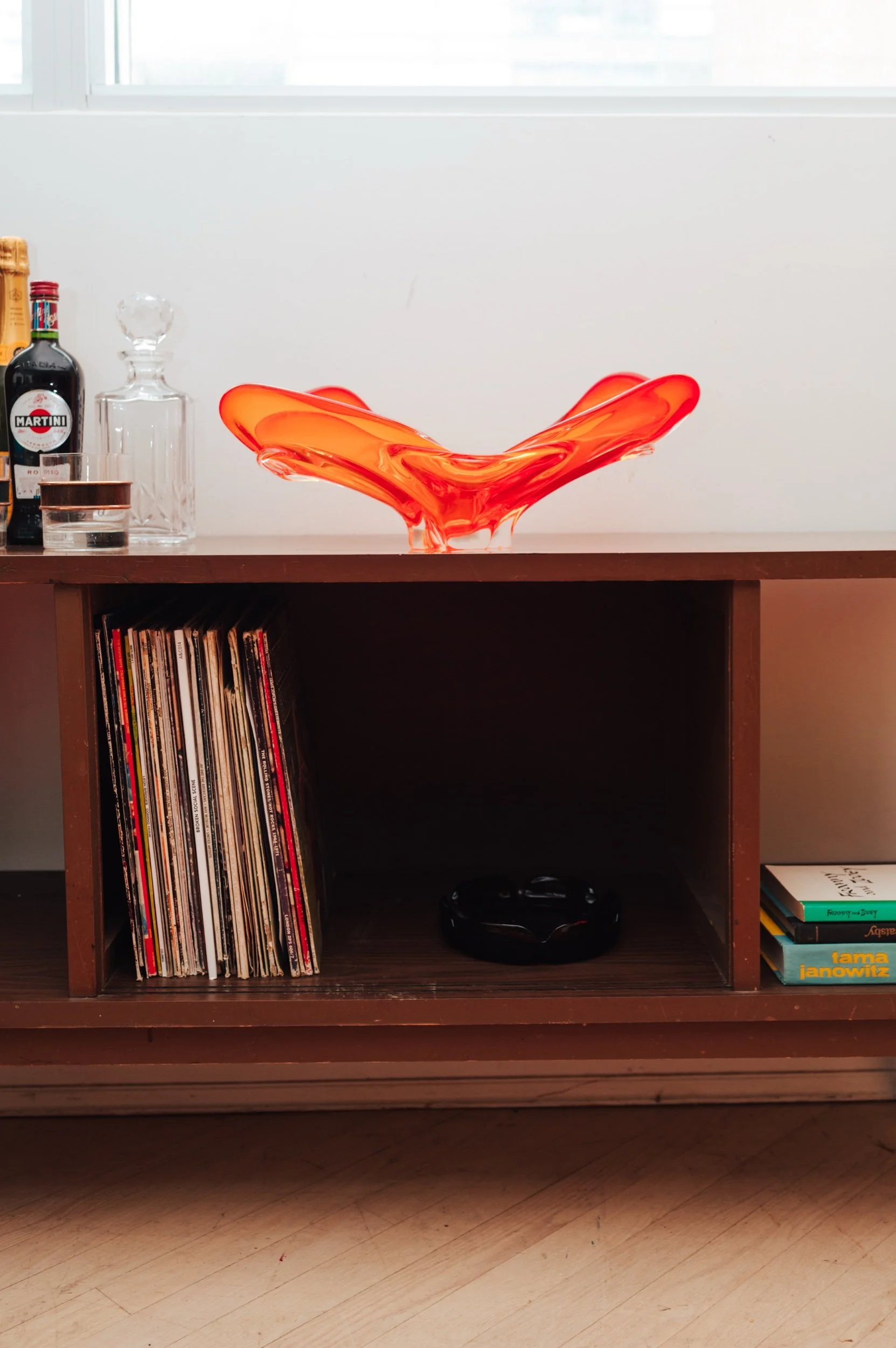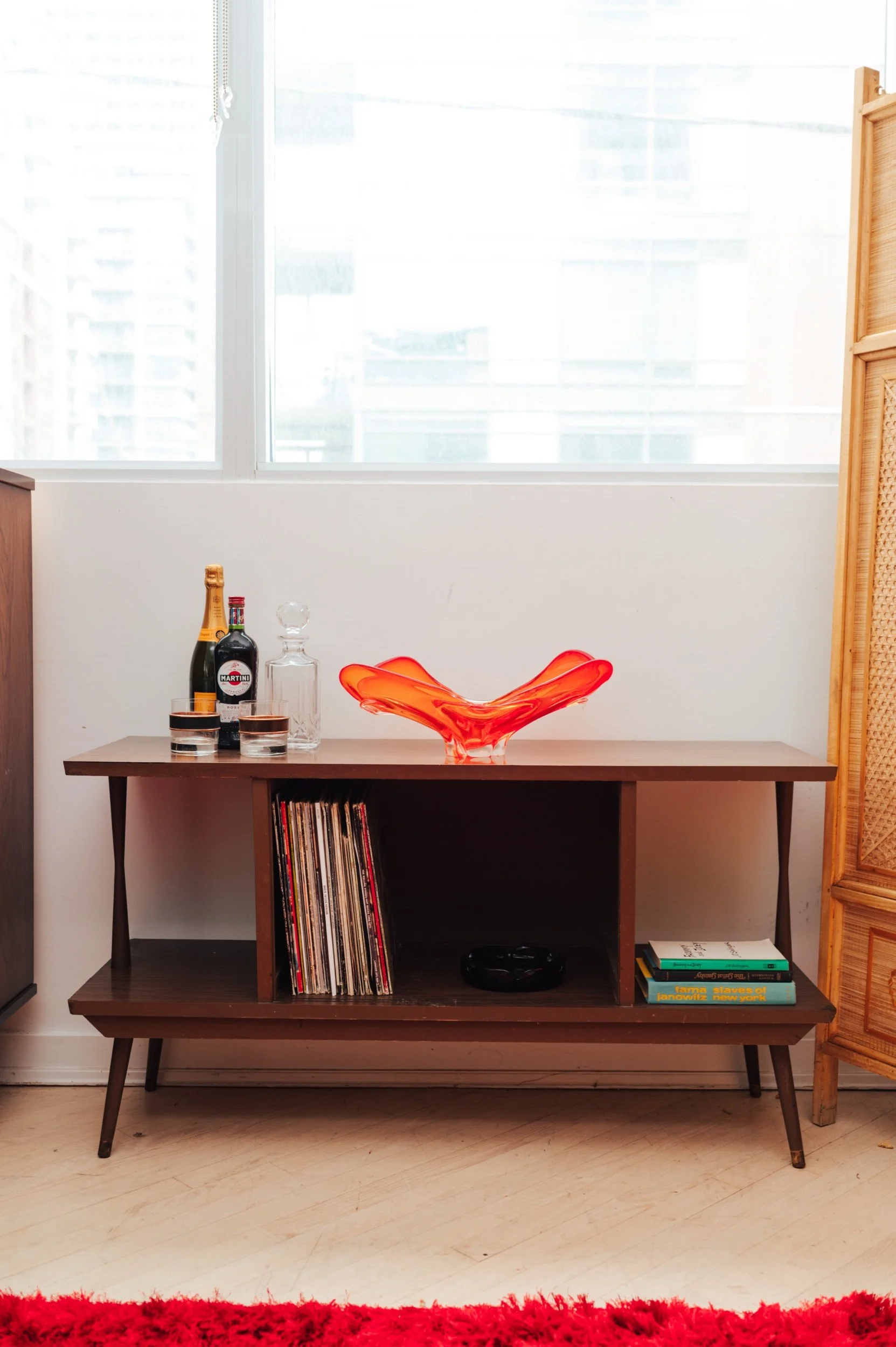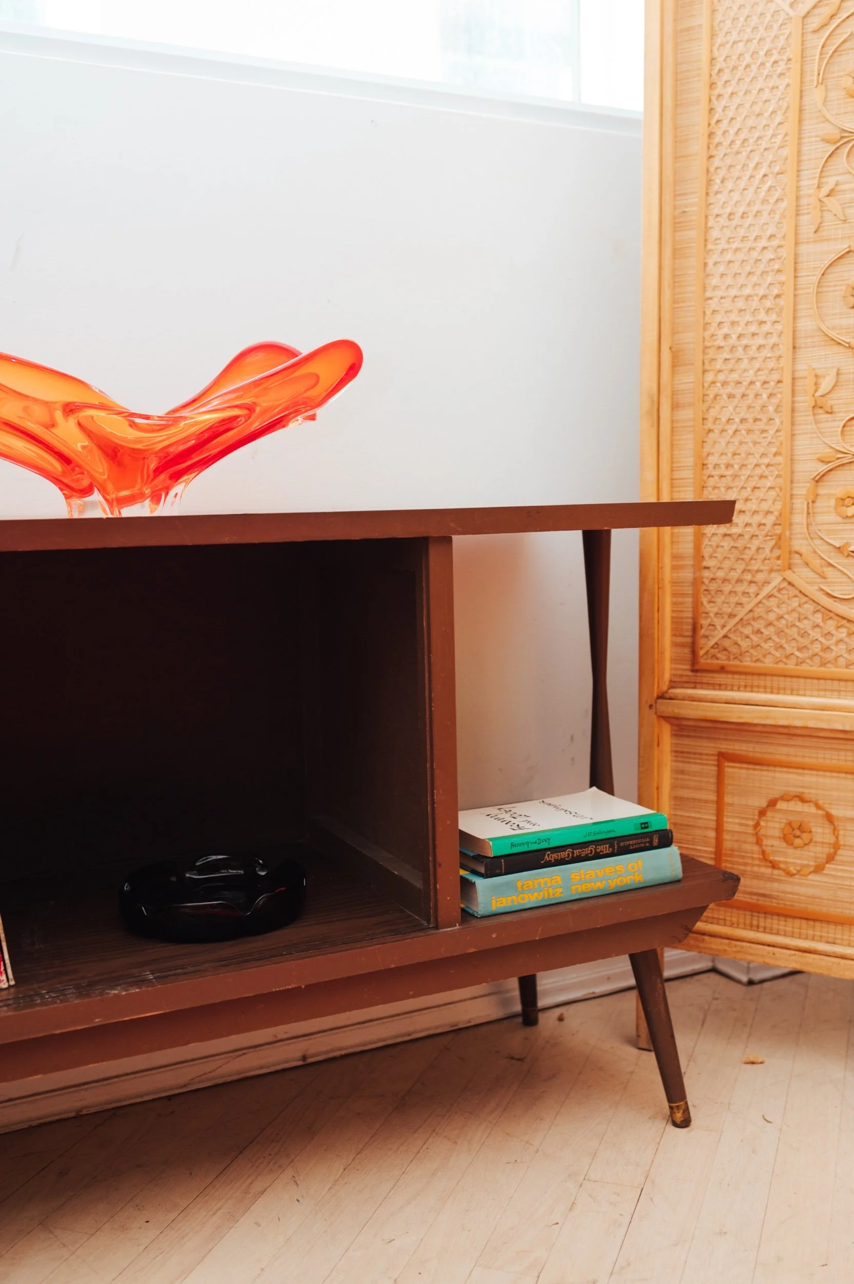Originally designed with doors, this one now lives as an open-format console—perfect for vinyl, books, or media. The proportions are especially good: low enough to sit under a window or float behind a sofa, with just enough structure to create visual rhythm across the shelf.