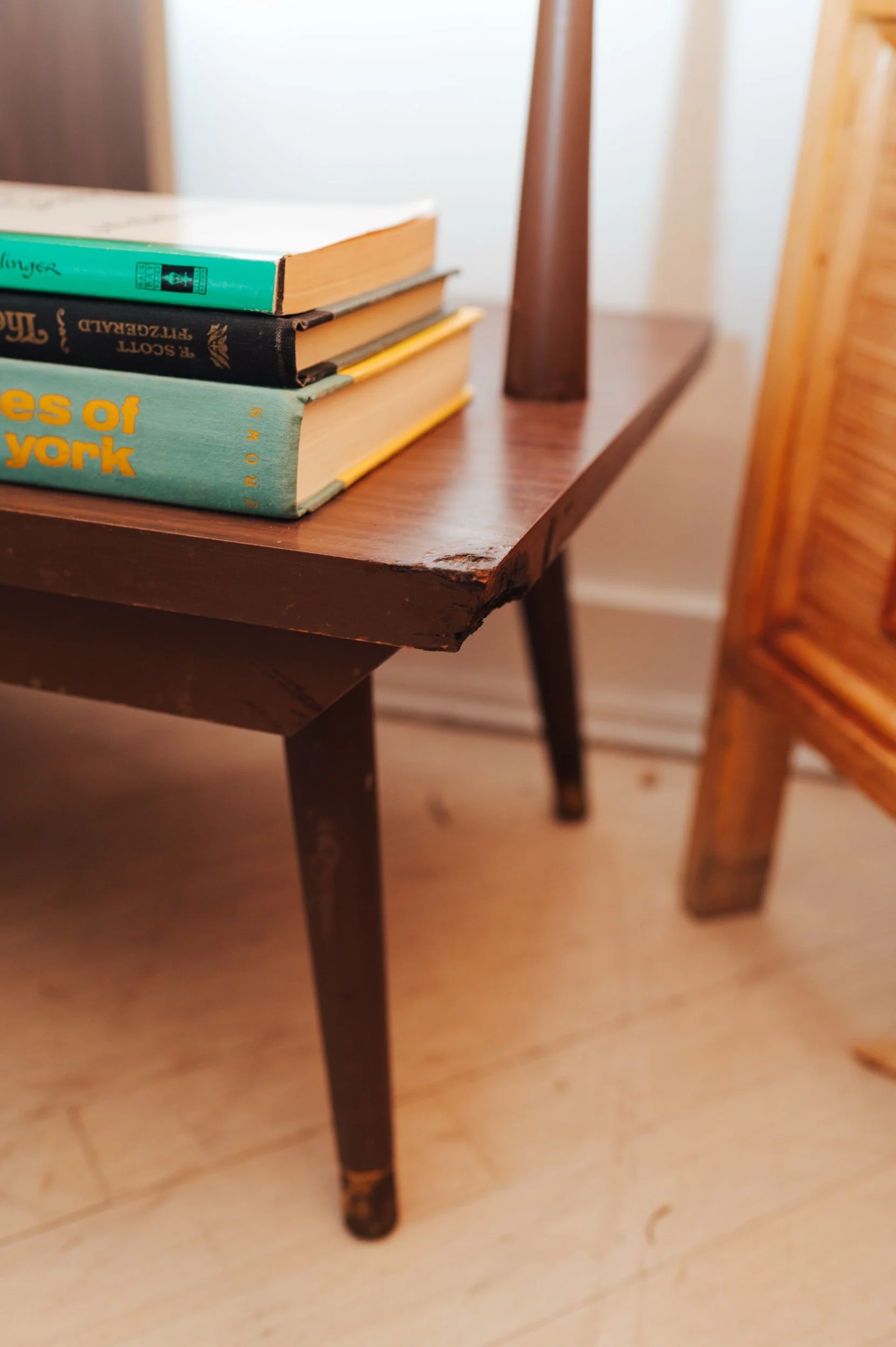 A clean, low-slung piece with that unmistakable midcentury profile—tapered legs, long horizontal line, and practical open storage that leans more “styled shelf” than traditional cabinet.