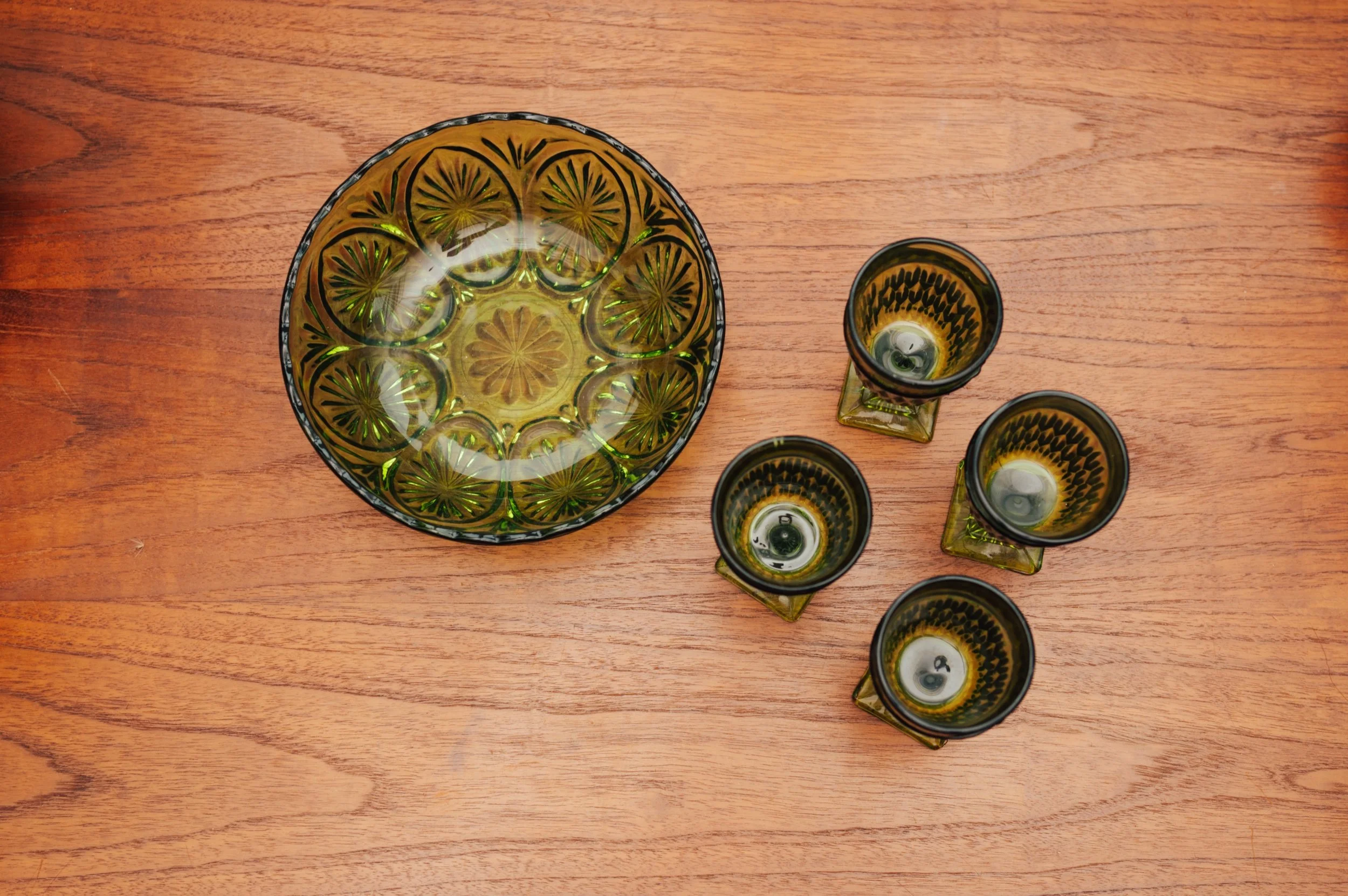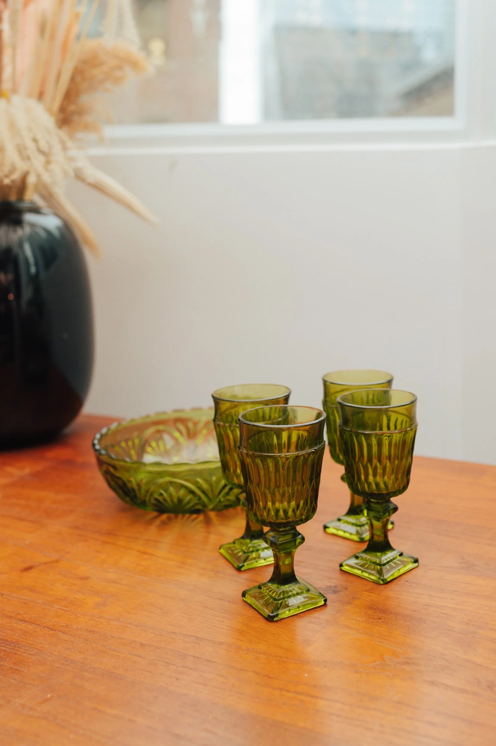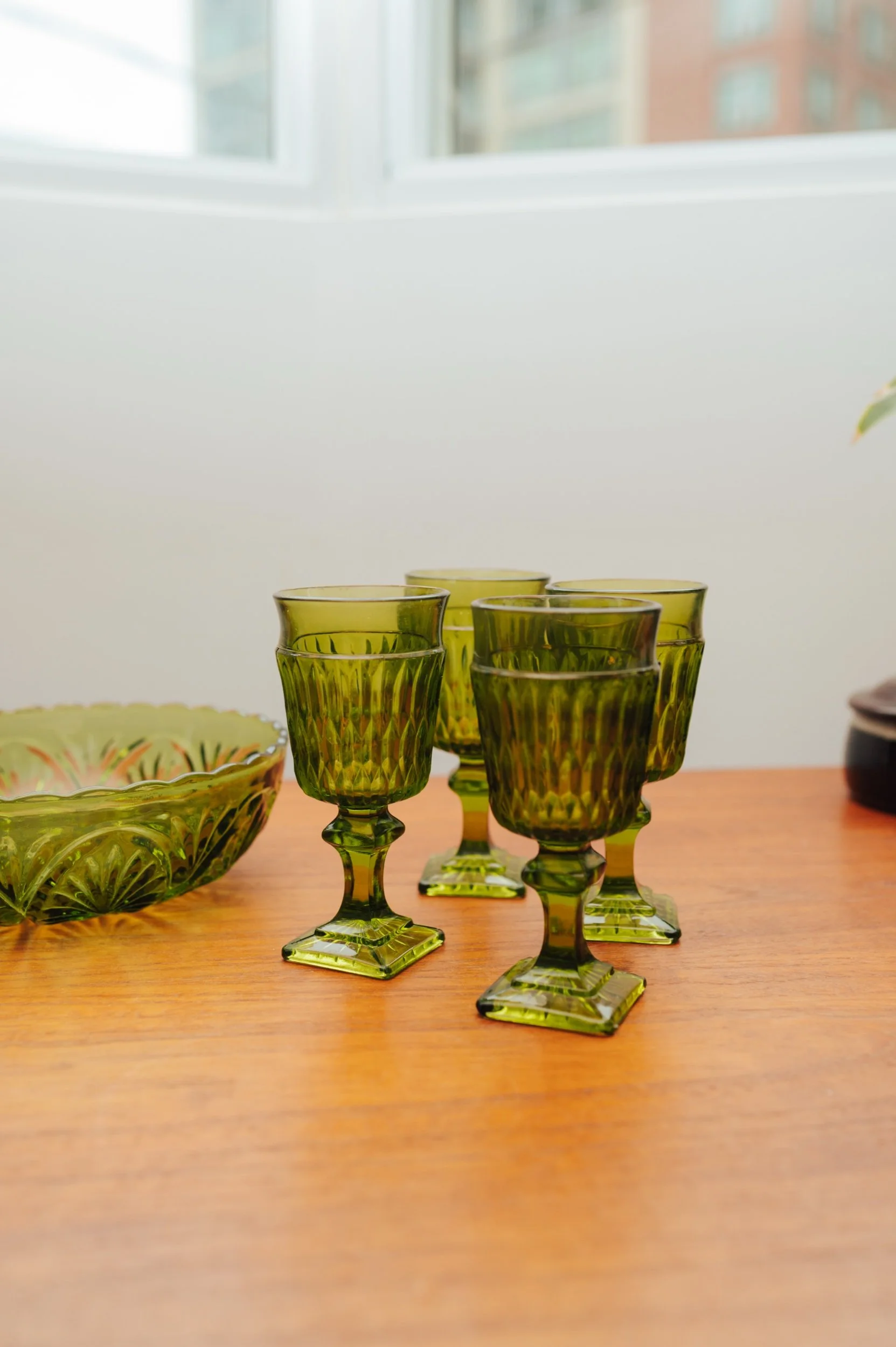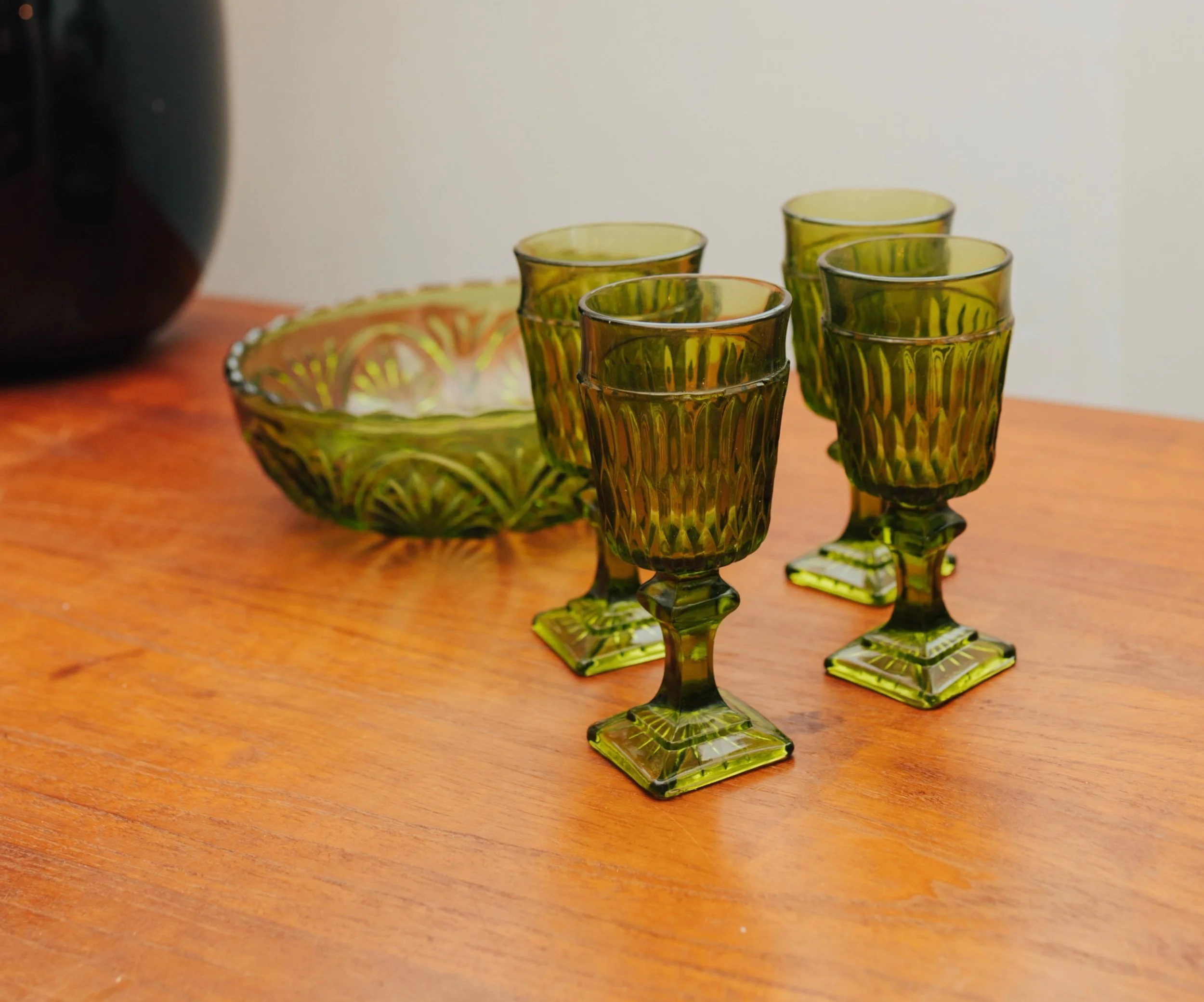 This five-piece collection includes four pedestal goblets with sculptural square bases, paired with a coordinating pressed glass serving bowl. The colour catches the light beautifully — a saturated green that feels both grounded and luminous.