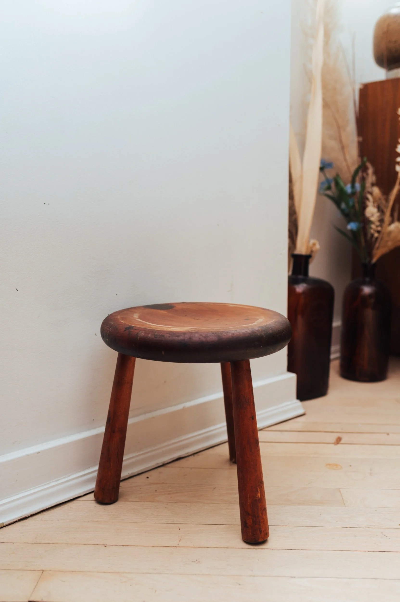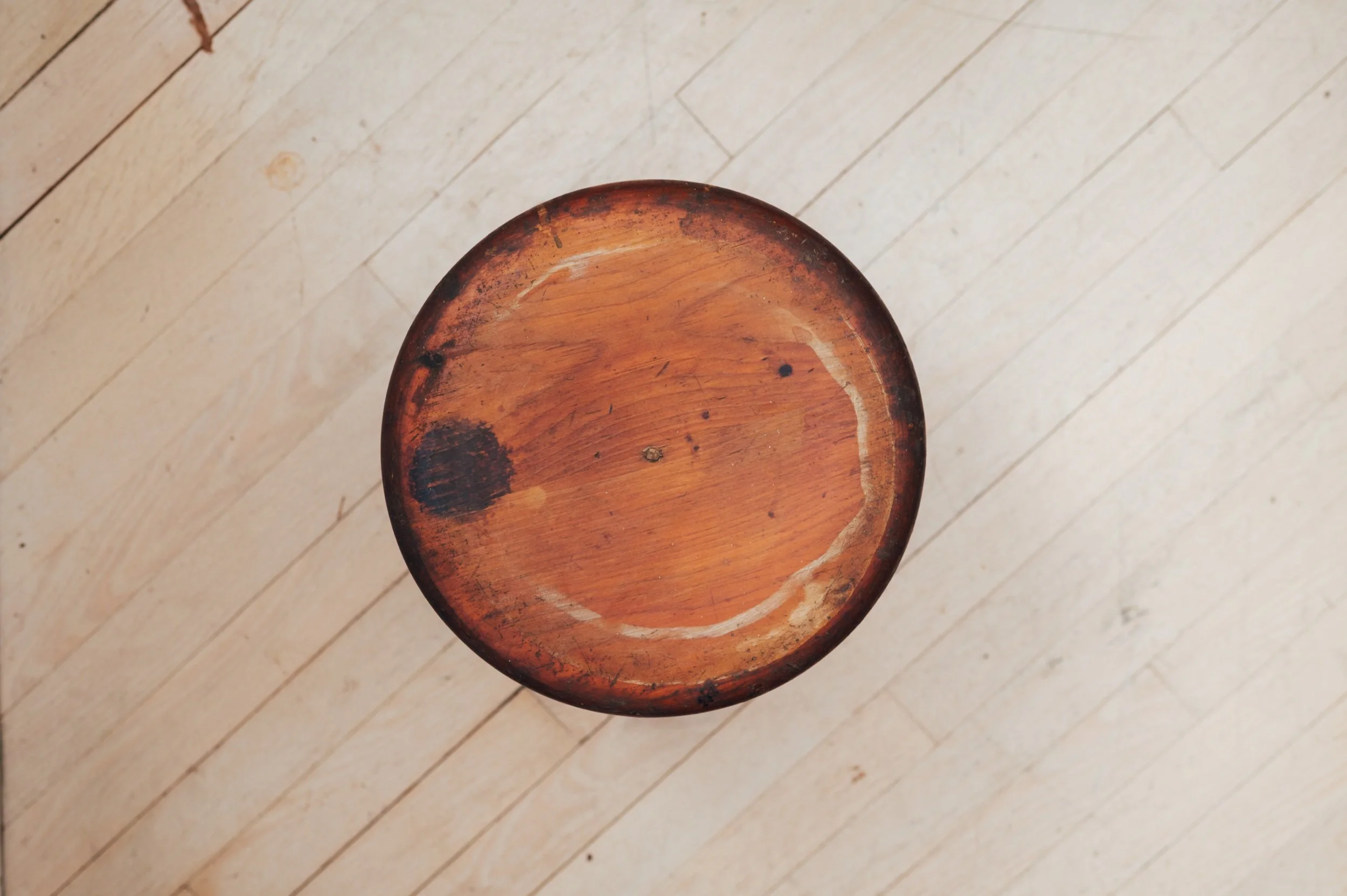 This vintage wooden stool features a simple three-leg construction and a rounded seat, softened by years of use. The surface tells the story—natural wear, darkened edges, and subtle markings that give it depth and character. It’s utilitarian at its core, but reads sculptural in the right setting.