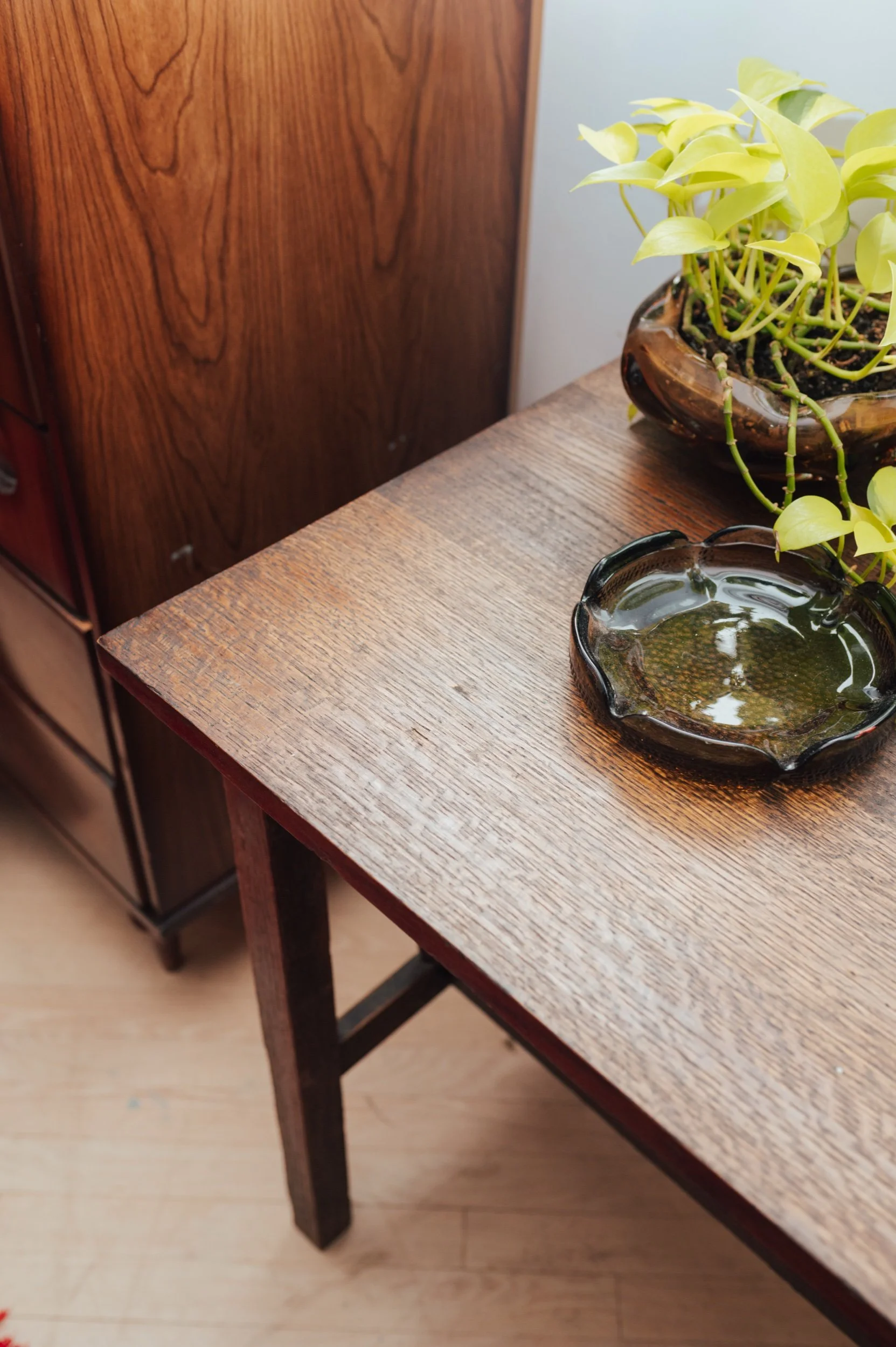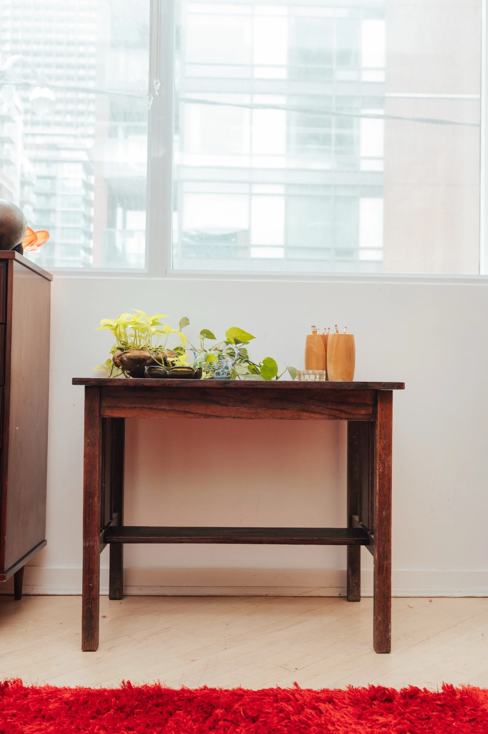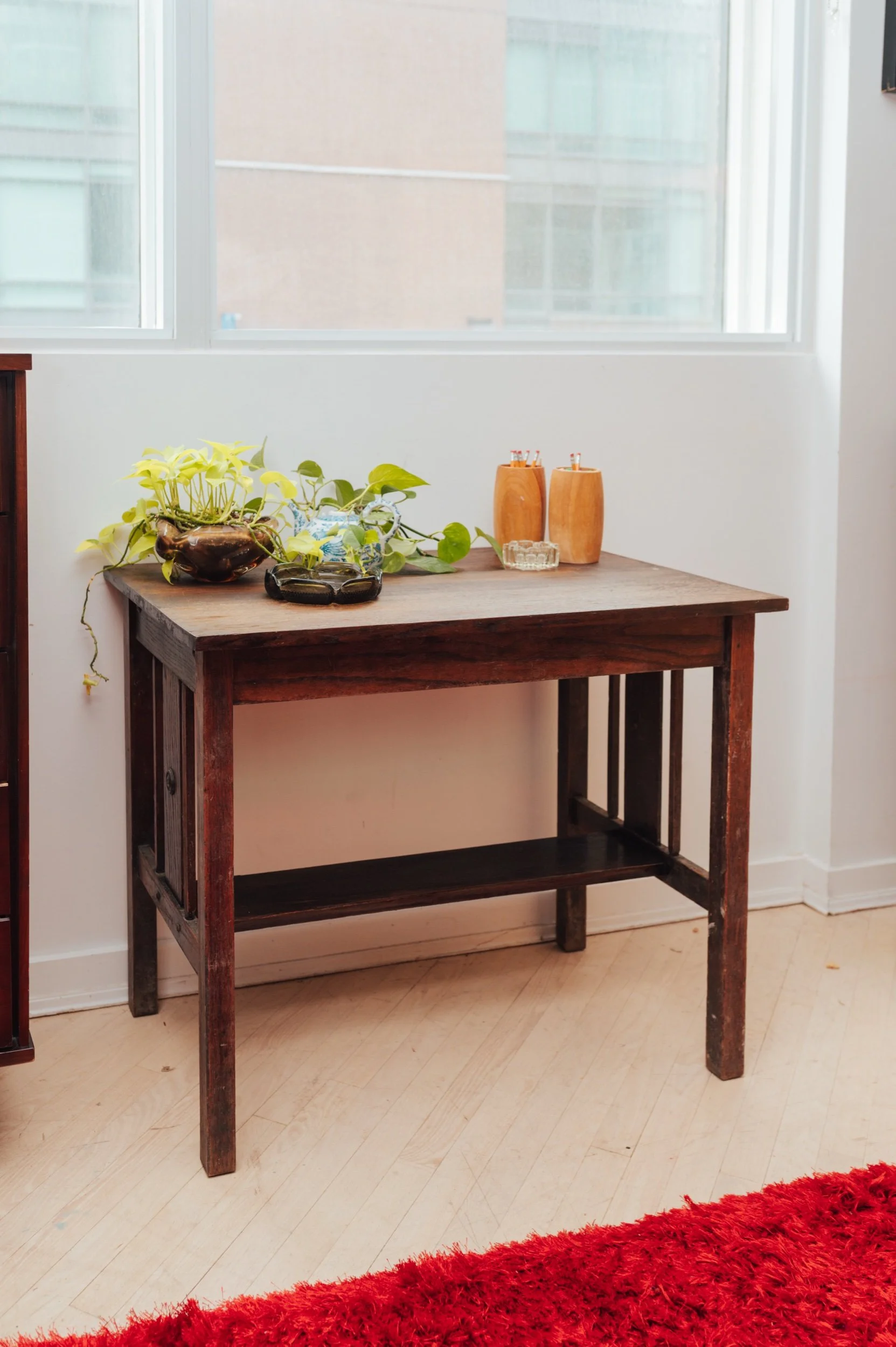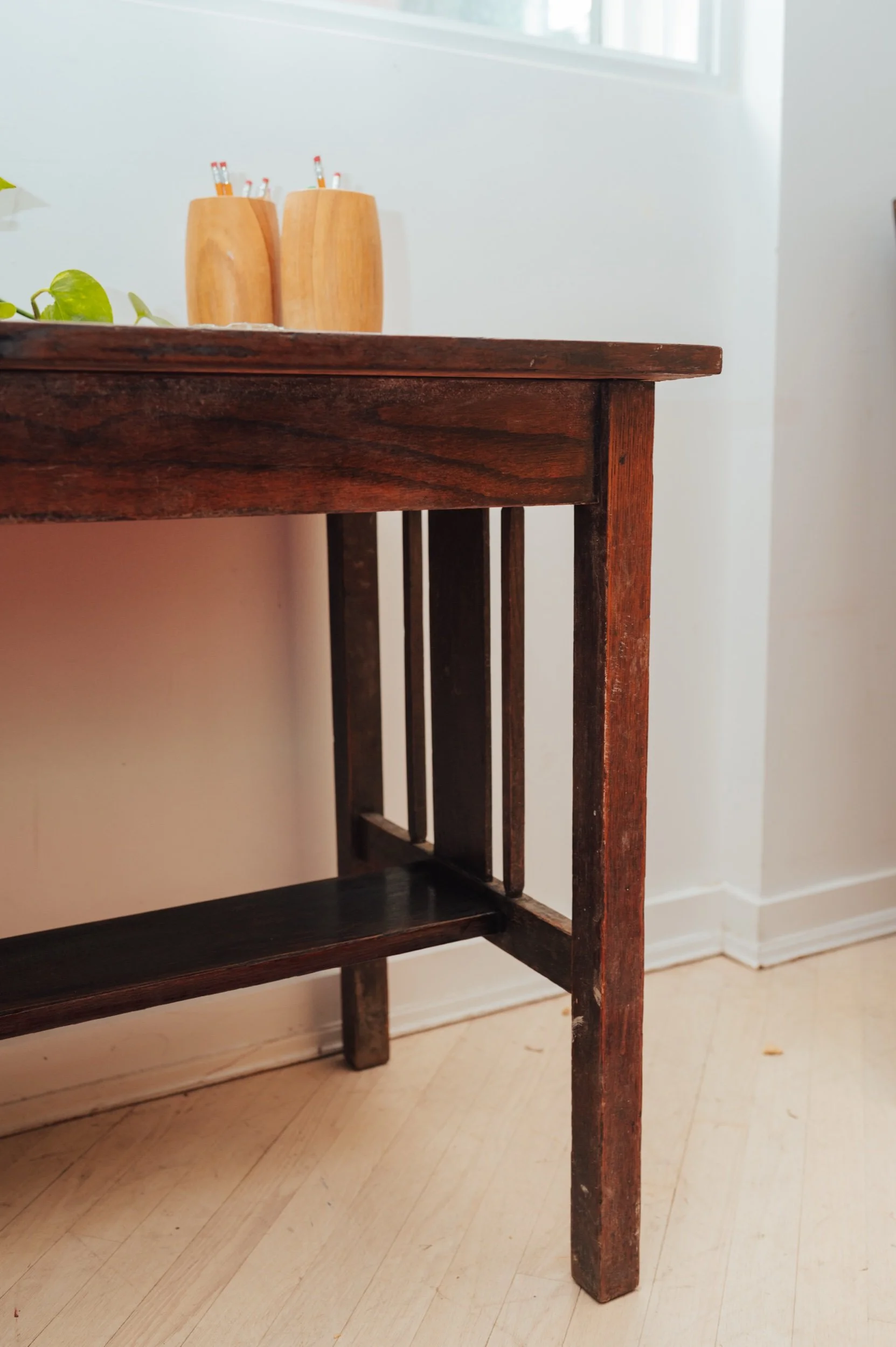 The proportions are especially good here: generous enough to work from, but still easy to place in smaller spaces. The lower stretcher shelf adds both structure and a spot for books, baskets, or layered styling.