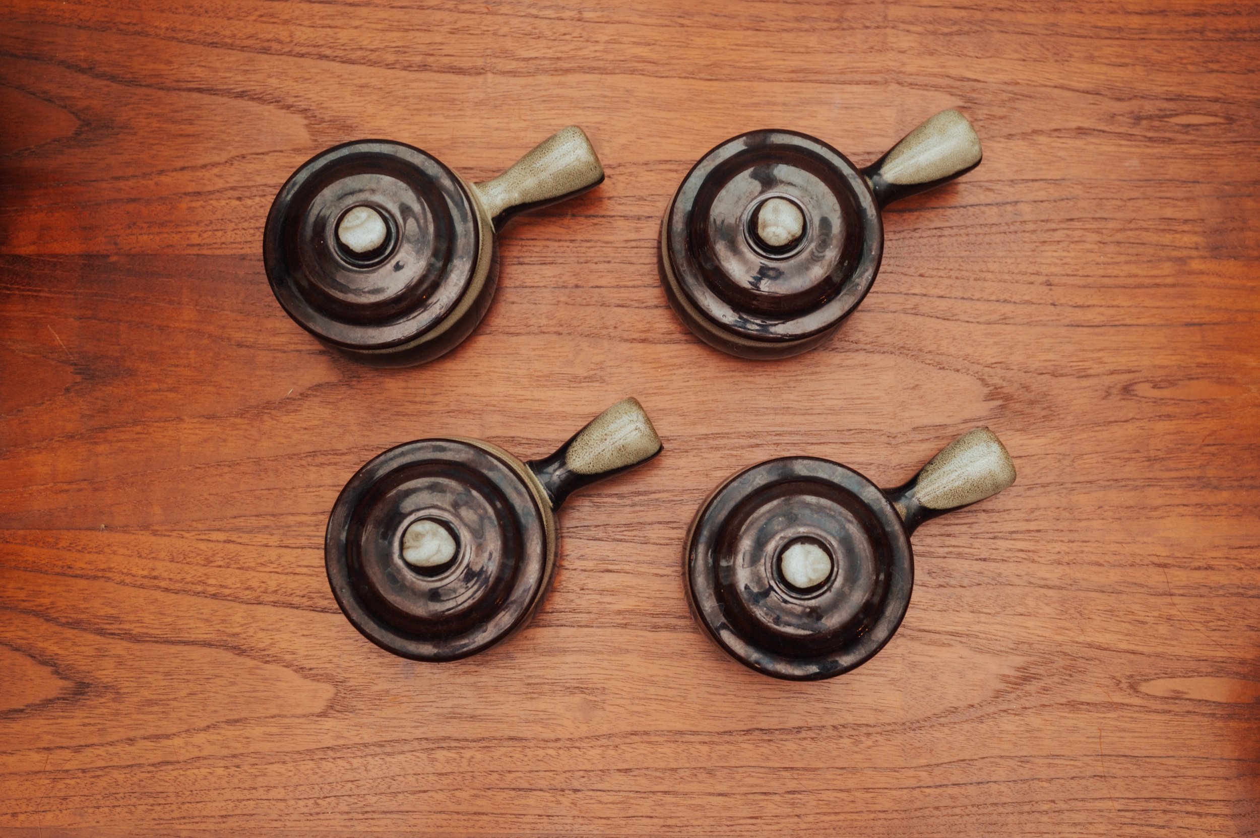 A quietly striking set of four vintage French onion soup bowls in a deep, espresso-toned glaze.