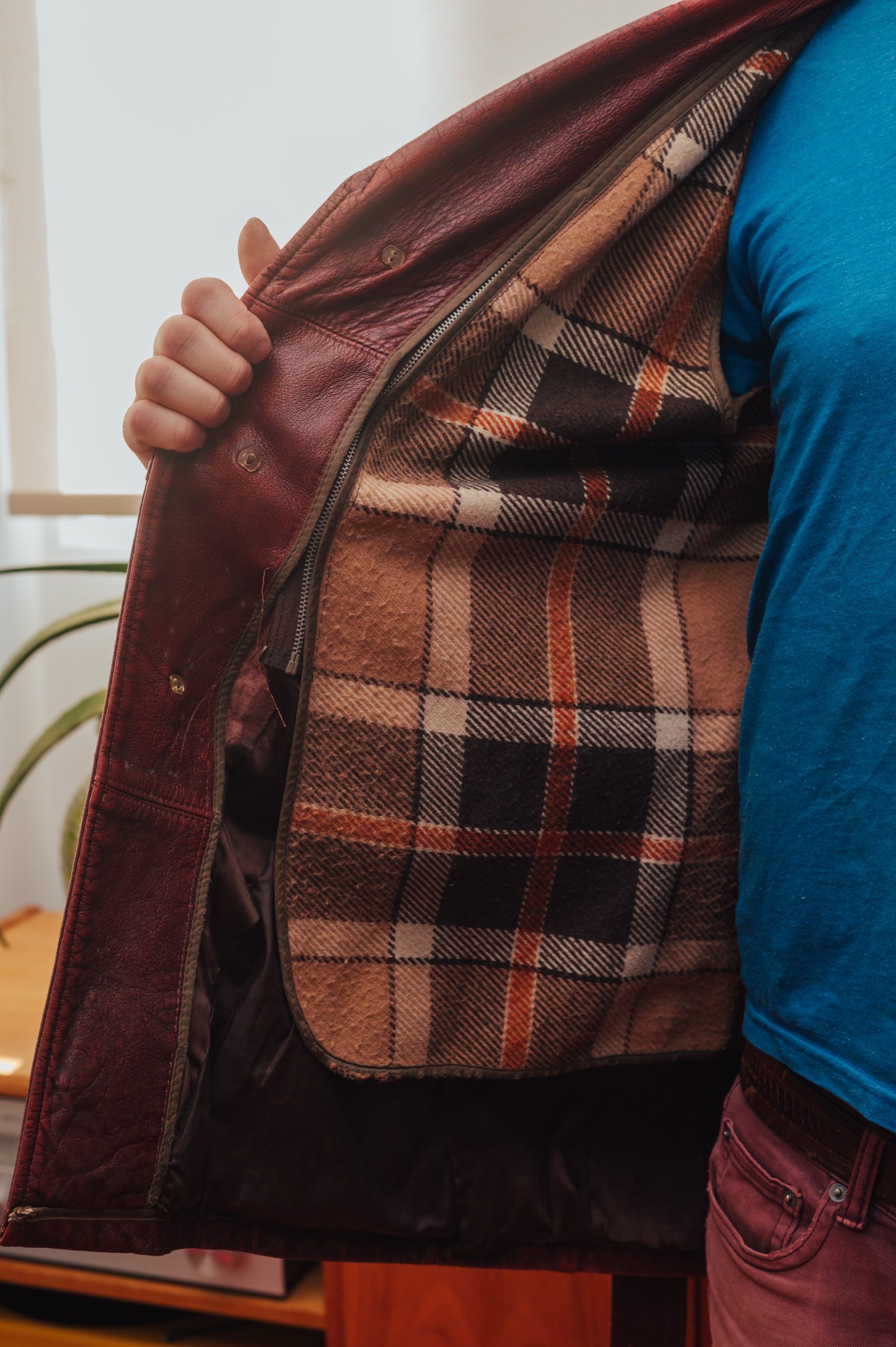 The leather has developed a deep patina over time, giving the coat that perfectly broken-in look that only vintage leather achieves. It’s substantial enough for cooler weather while still maintaining a sleek profile.