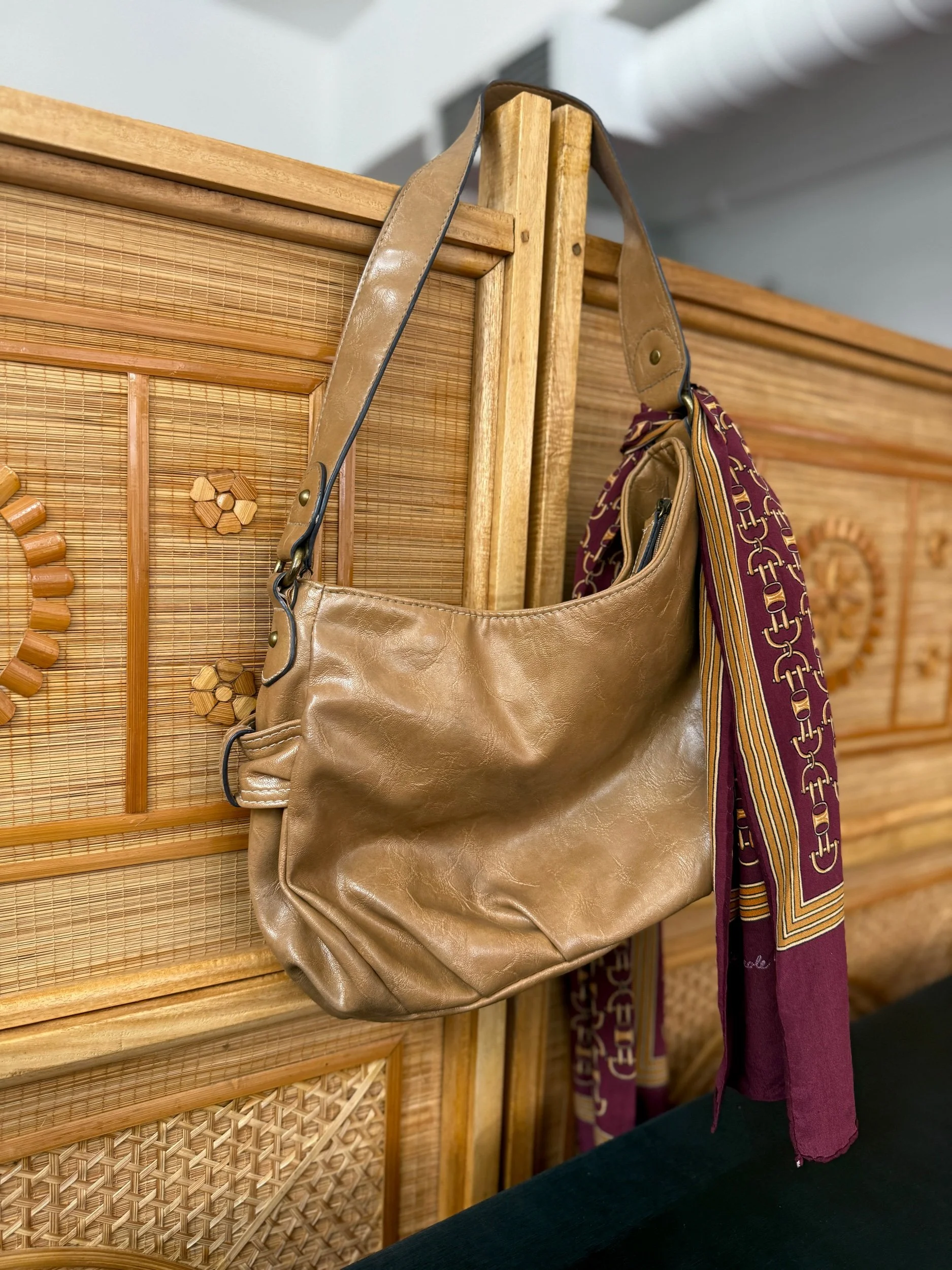 Soft, slouchy shoulder bag by Rosetti New York in a rich tan/caramel tone. Features a relaxed hobo silhouette with subtle gathering, gold-tone hardware, and an adjustable strap for the perfect shoulder fit.