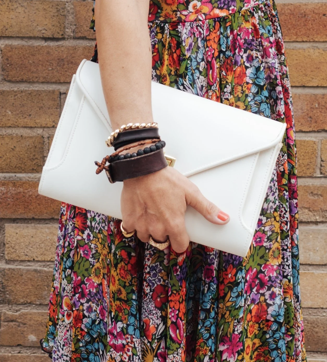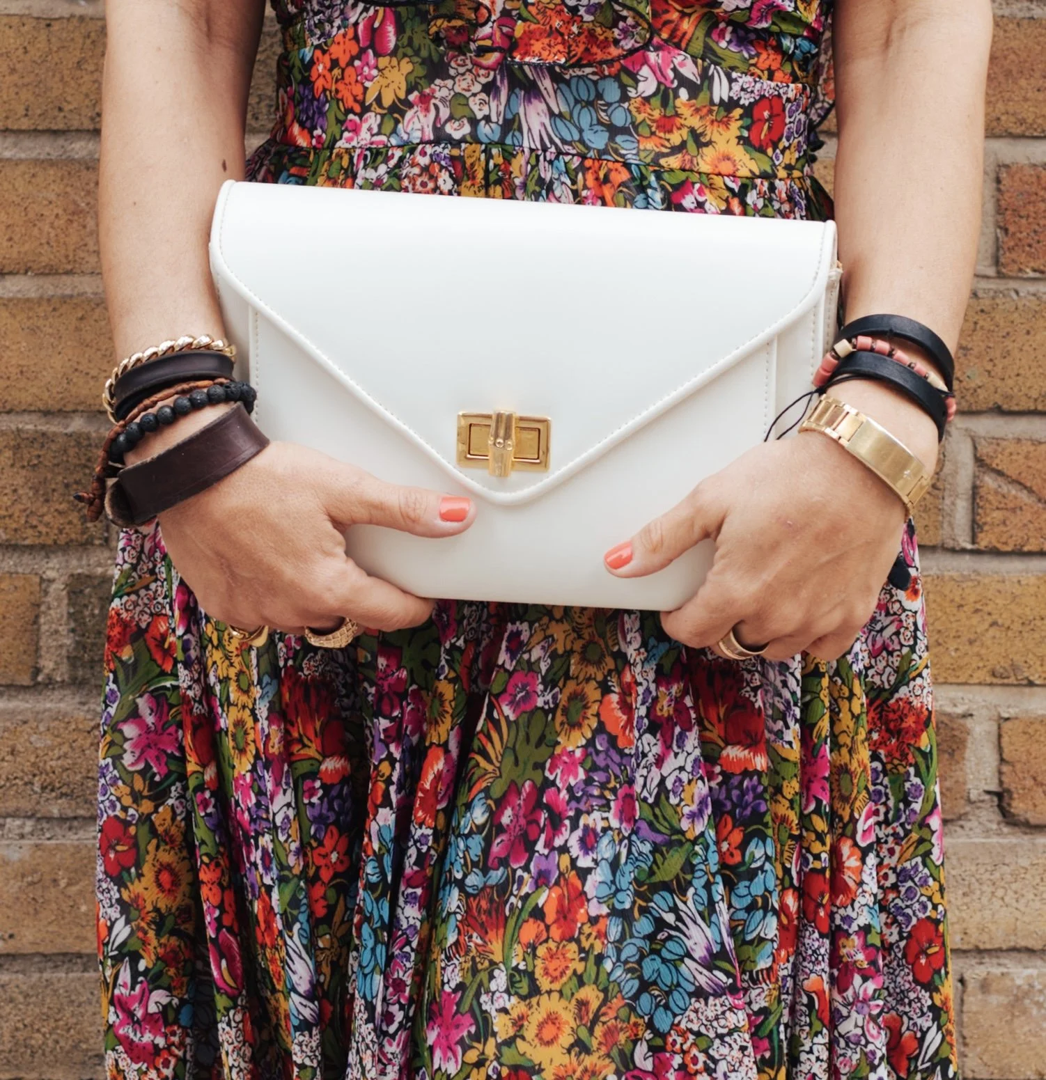 Soft ivory-toned faux leather with a structured envelope silhouette and gold-tone clasp. It reads polished without feeling precious. Carry it as a clutch, or attach the chain strap when you want your hands free.