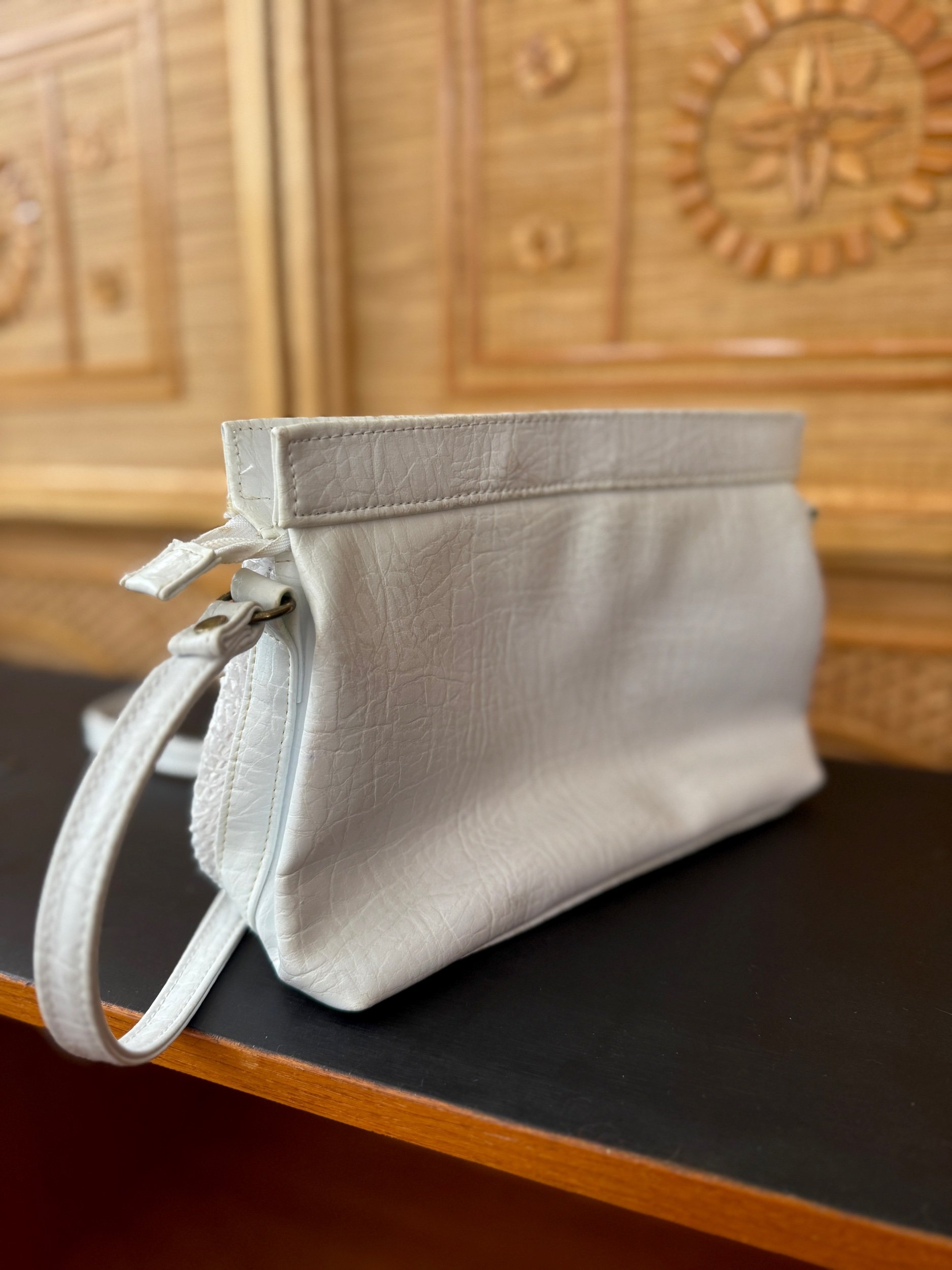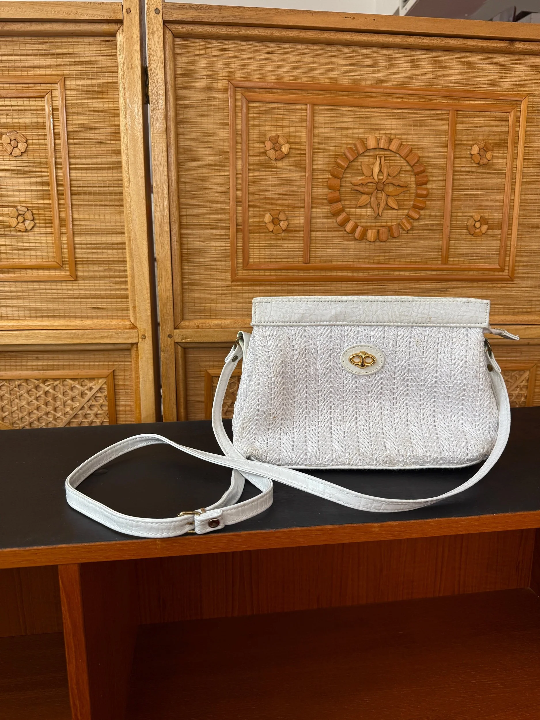 Vintage white woven crossbody bag with a subtle textured pattern and gold-tone clasp detail — the kind of effortless piece that goes with everything.